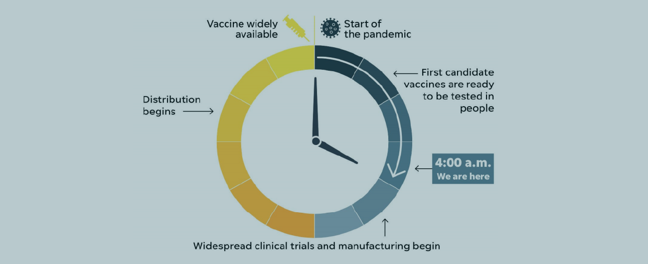 Este gráfico es de mucha utilidad para comprender la importancia de los esfuerzos que la medicina está realizando en beneficio de toda la humanidad. Al respecto, el Dr. Michelle McMurry-Heath, presidente y CEO de Biotechnology Innovation Organization explicó que “si nos posicionamos en el mes de junio estaríamos a la 4 de la mañana; lo que significa que a las 12 del medio día tendríamos la vacuna lo que se traduce para febrero o abril del 2021”.